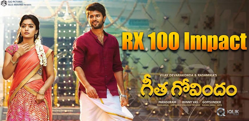 Now, the impact of ‘RX 100’ is being seen on the upcoming release ‘Geetha Govindam’. A leaked footage from the movie shows a bus scene and that is actually the chartbuster ‘Inkem inkem inkem kaavale…’. In that, the radical stud Vijay Deverakonda and the dove eyed Kannada Hudugi Rashmika Mandanna are indulging in some bold romance.